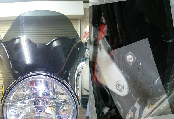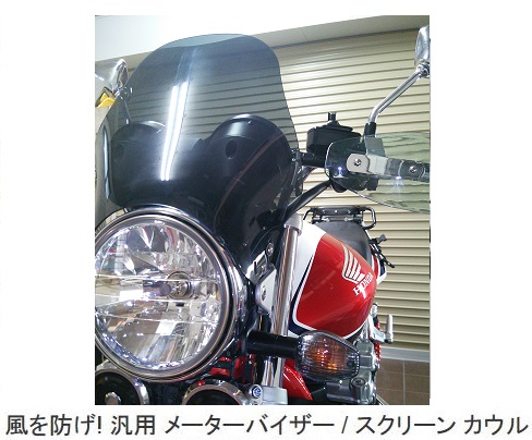 風を防げ! 汎用 メーターバイザー / スクリーン カウル 風を防げ! 汎用 メーターバイザー / スクリーン カウル amazon ¥ 2,980 取りつけ金具に 少し細工が必要です まぁ”切るだけで済みます それと 車体側に1.6程のスプリングワッシャーをねじり直し ワッシャーにした物を入れて有ります (挟みこむ事でカバーが楕円に変形するのを抑える為) こんな感じで 取りつけ メーターカバーやヘッドライトとのクリアもある程度取れてるし 倒れても 前方へ 自分への被害は少ないかと...風避け効果? そりゃ~ 本人の感覚だから・・・何ともです見た目が変わったのが良いかなぁ~ 第一安価だし (^。^)